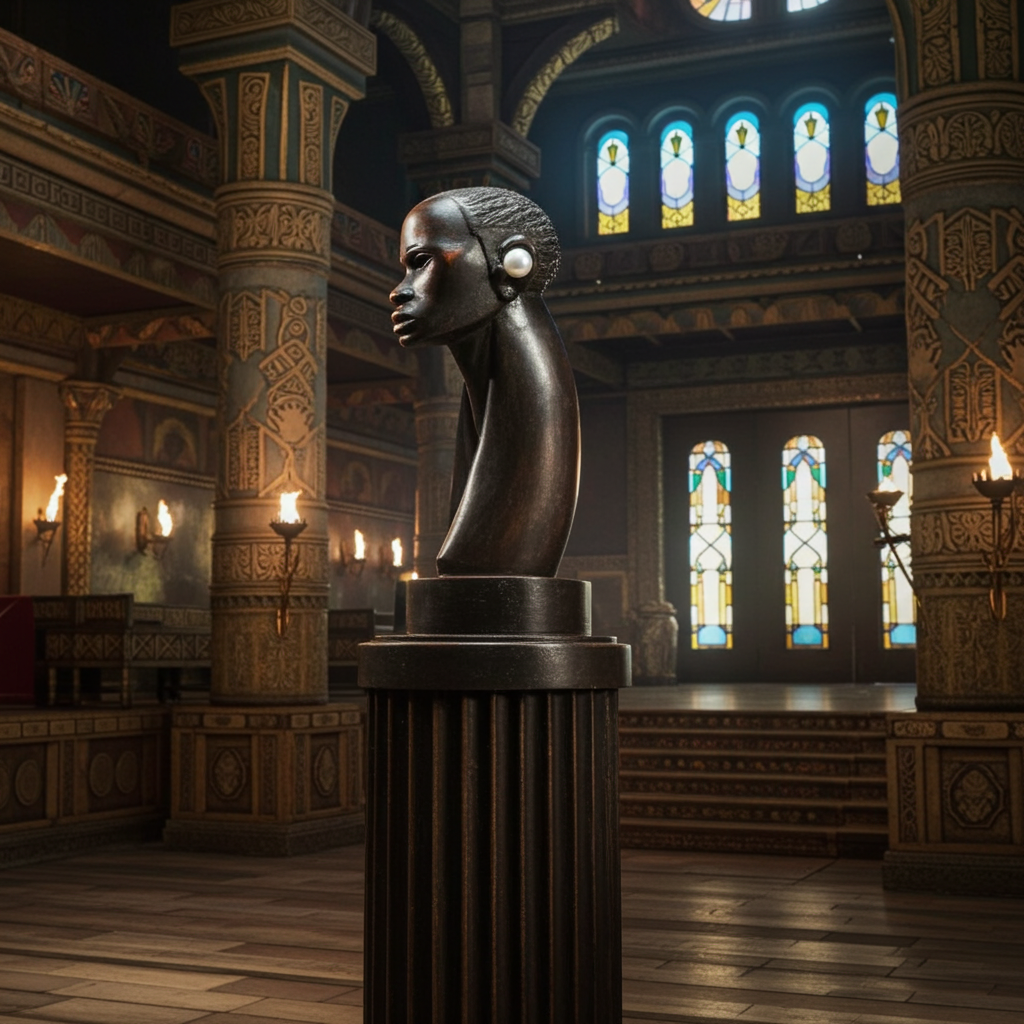 Product Description A curated collection showcasing raw gemstone beauty: a radiant 20-carat round Moissanite in VVS1 clarity paired with a luminous 20mm South Sea shell pearl, presented in an authentic tribal African display setting.piece that bridges heritage and sophistication.